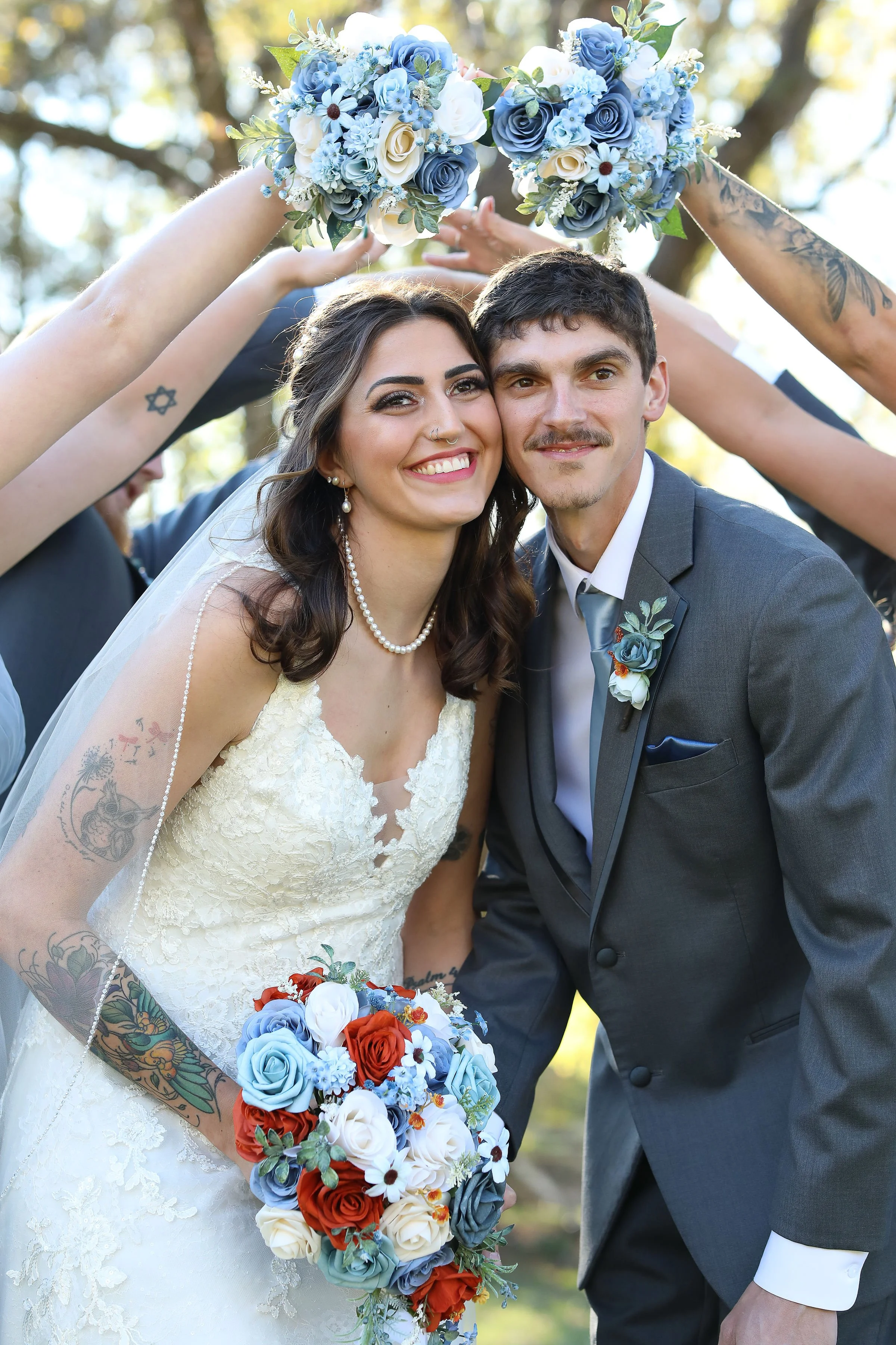 This joyful moment captures Megan & Isaiah surrounded by their favorite people a circle of love holding blooms in their wedding colors of powder blue, navy, ivory, and pops of terracotta. Their smiles say everything: pure happiness, deep connection, and the excitement of stepping into forever together. As their wedding party lifted their bouquets overhead, it created a frame of florals that felt symbolic of the strong support system around them. Itโs a fun, heartfelt snapshot that reflects exactly who they are as a couple vibrant, genuine, and full of warmth. ๐โจ