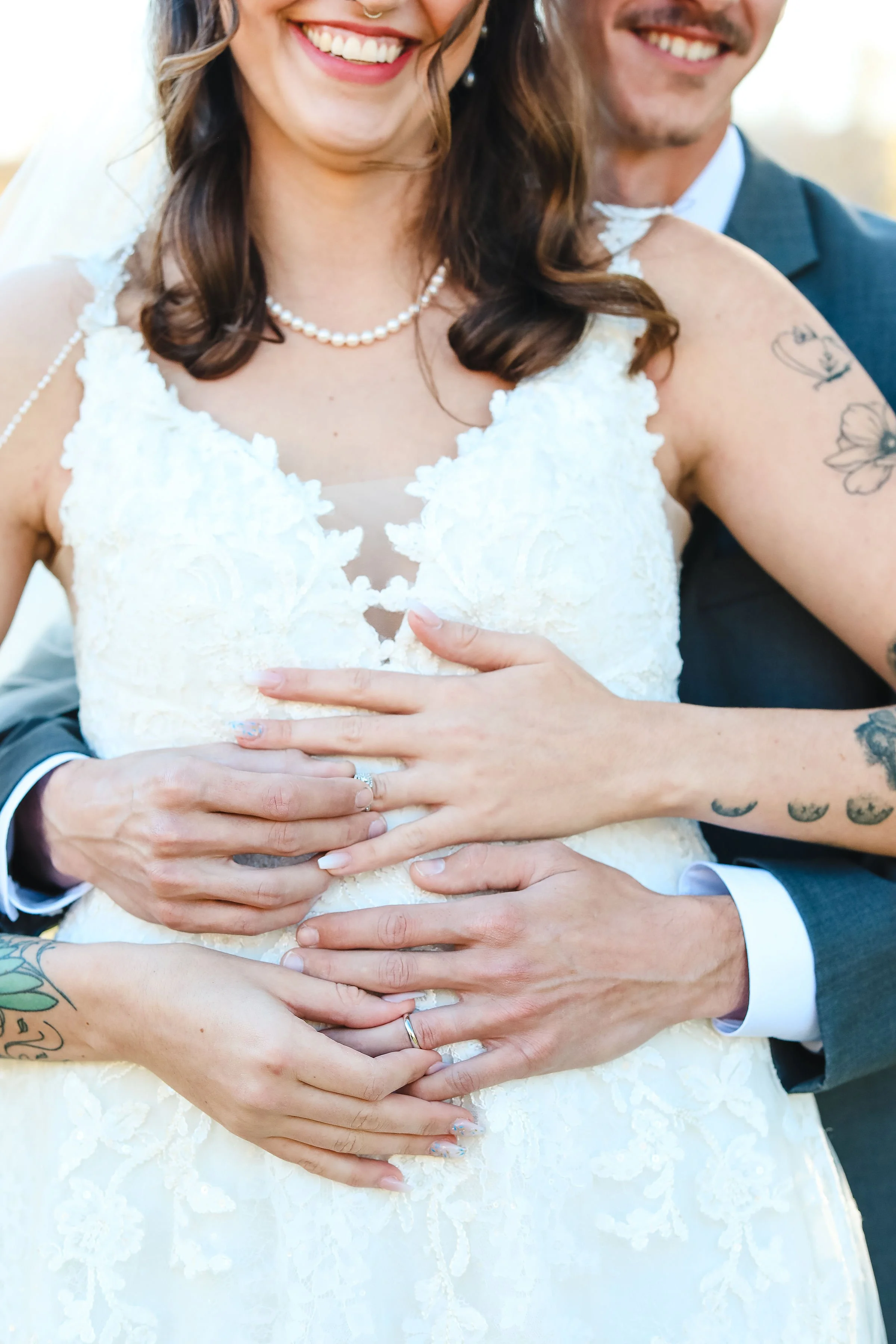 Thereโs something incredibly tender about this moment Megan and Isaiahโs hands intertwined, layered softly over her lace gown, showing the kind of love that feels steady, safe, and beautifully unspoken. Their rings, their touch, and their closeness tell a story all on their own a quiet reminder that marriage isnโt just about the big moments, but the little ones where two hearts choose each other again and again.