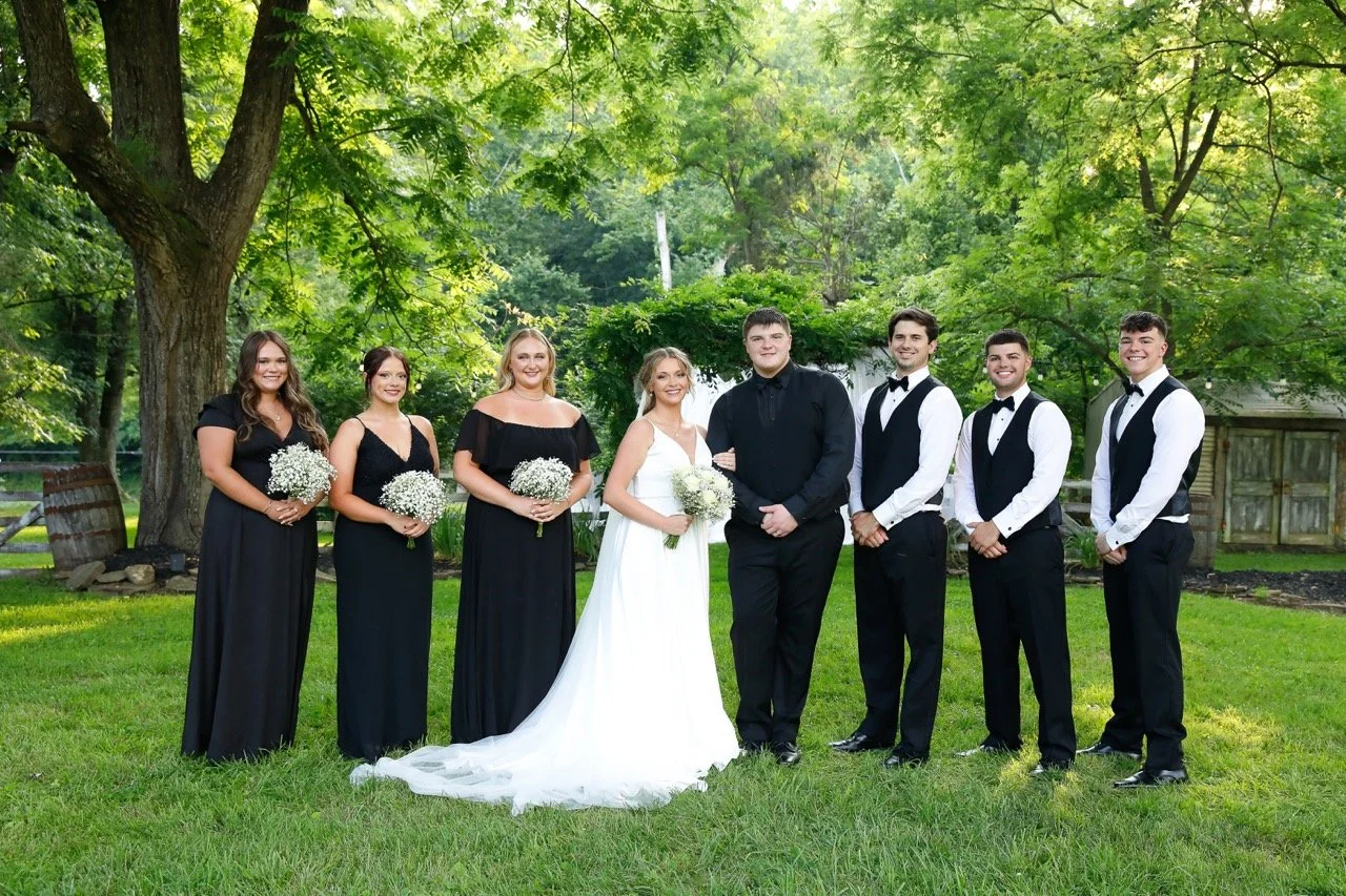 Surrounded by their closest friends and family, the couple stood proudly with their wedding party. The bridesmaids looked stunning in classic black dresses, each holding simple yet elegant bouquets of baby’s breath that added a soft contrast to their chic dresses. The groomsmen, in sharp black suits and bowties rented from Nandels, stood proudly beside the groom, creating a perfectly balanced bridal party that was equal parts sophistication and warmth.